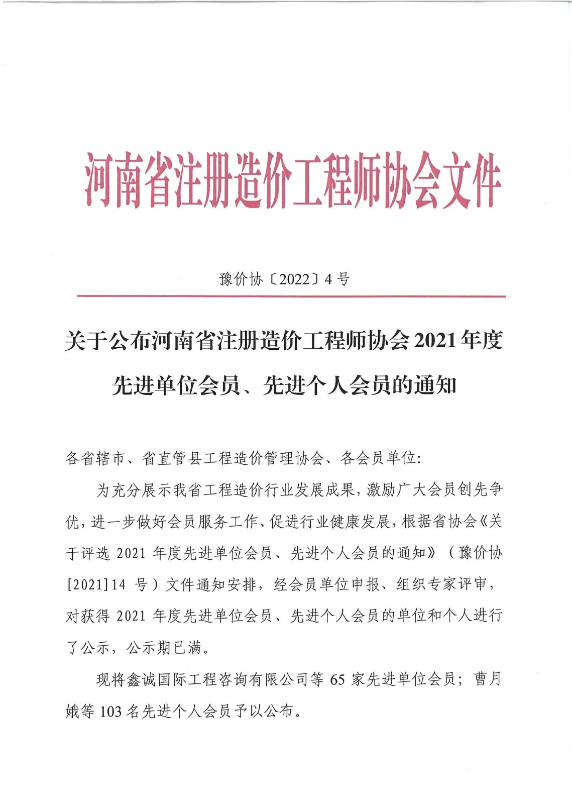 近日,河南省注册造价工程师协会公布了“河南省注册造价工程师协会2021年度先进单位会员、先进个人会员的通告”。我公司荣获河南省注册造价工程师协会2021年度先进单位会员荣誉称号,徐文、李杰、贾世军三位同志获得先进个人会员的荣誉。