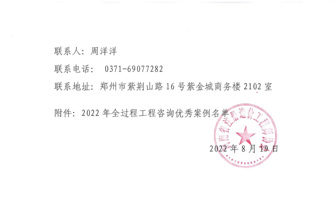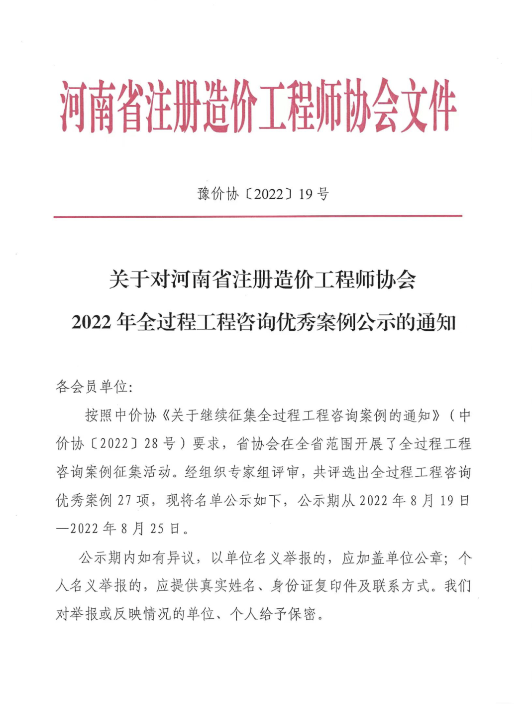 近日,河南省注册造价工程师协会公布了“河南省注册造价工程师协会2022年全过程工程咨询优秀案例公示的通告”。我公司三项案例荣获2022年全过程工程咨询优秀案例荣誉称号。