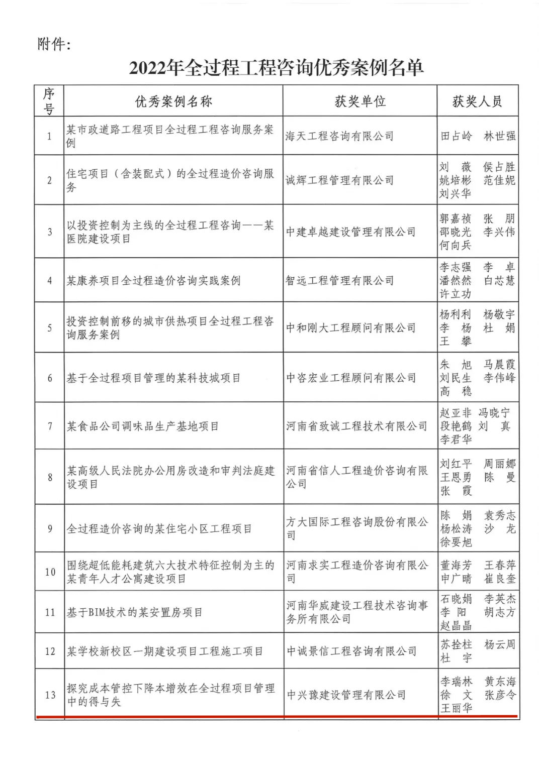 喜报|中兴豫荣获“河南省注册造价工程师协会2022年全过程工程咨询优秀案例”荣誉称号