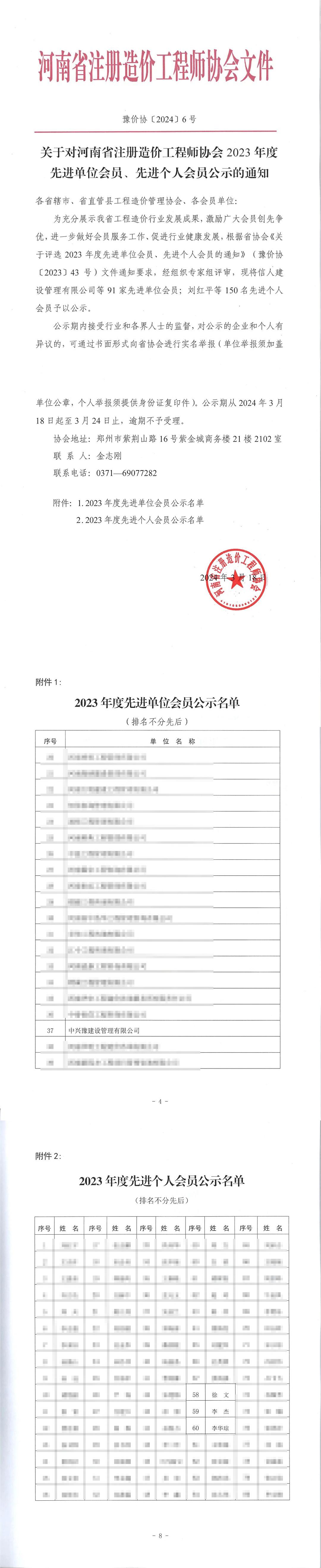 近日,河南省注册造价工程师协会公布了《关于对河南省注册造价工程师协会2023年度先进单位会员、先进个人会员公示的通知》,九游官方版web站入口荣获2023年度先进单位会员,徐文、李杰、李华琼荣获2023年度先进个人会员荣誉称号!